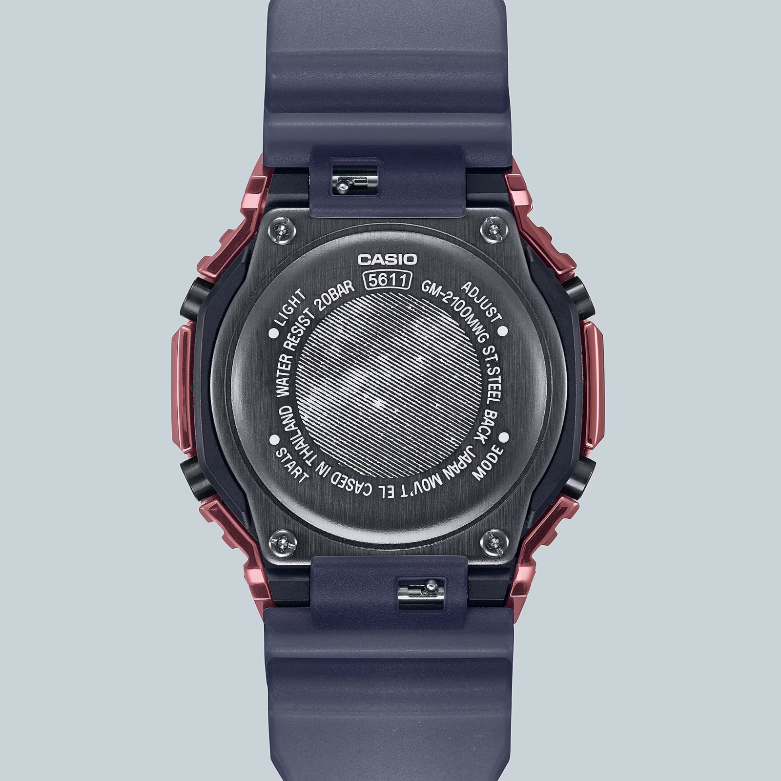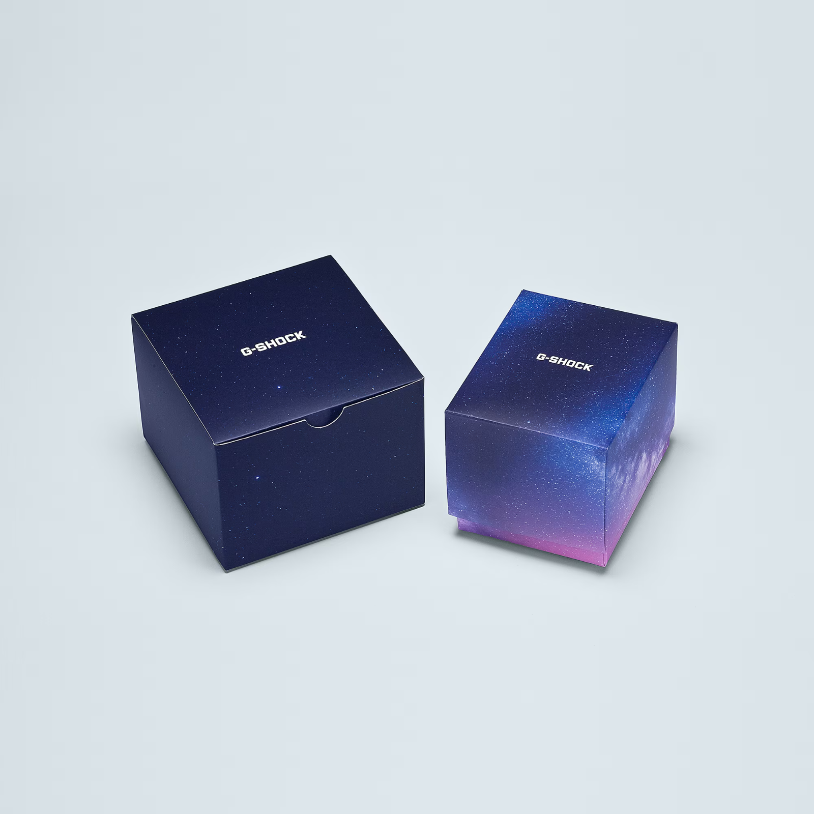 This limited edition starts with the GM-2100 and recreates its iconic octagonal bezel in purple ion-plated metal with a laser-printed galaxy motif. The dial features a gradation of color in a vapor deposition finish, evoking the Milky Way shining in the night sky. The band echoes the night sky image, its depth captured with a matte translucent band in navy blue resin. The case back is ion plated in black and laser engraved with a design inspired by the Milky Way.