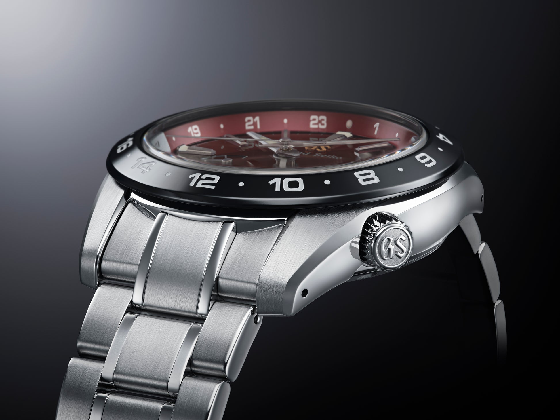 The dark red dial of this new Sport Collection GMT takes inspiration from a vivid sunrise as it illuminates the steep landscape of Japan’s Hotaka mountain range in summer. As with all Grand Seiko GMT watches, its ease of use is ensured through the local hour hand, which can be set independently, forward or backward, while the watch is running, ensuring precision is maintained when changing time zones according to one’s travels. Set against the dark red dial, the silver GMT hand further enhances the high legibility for which Grand Seiko is renowned.