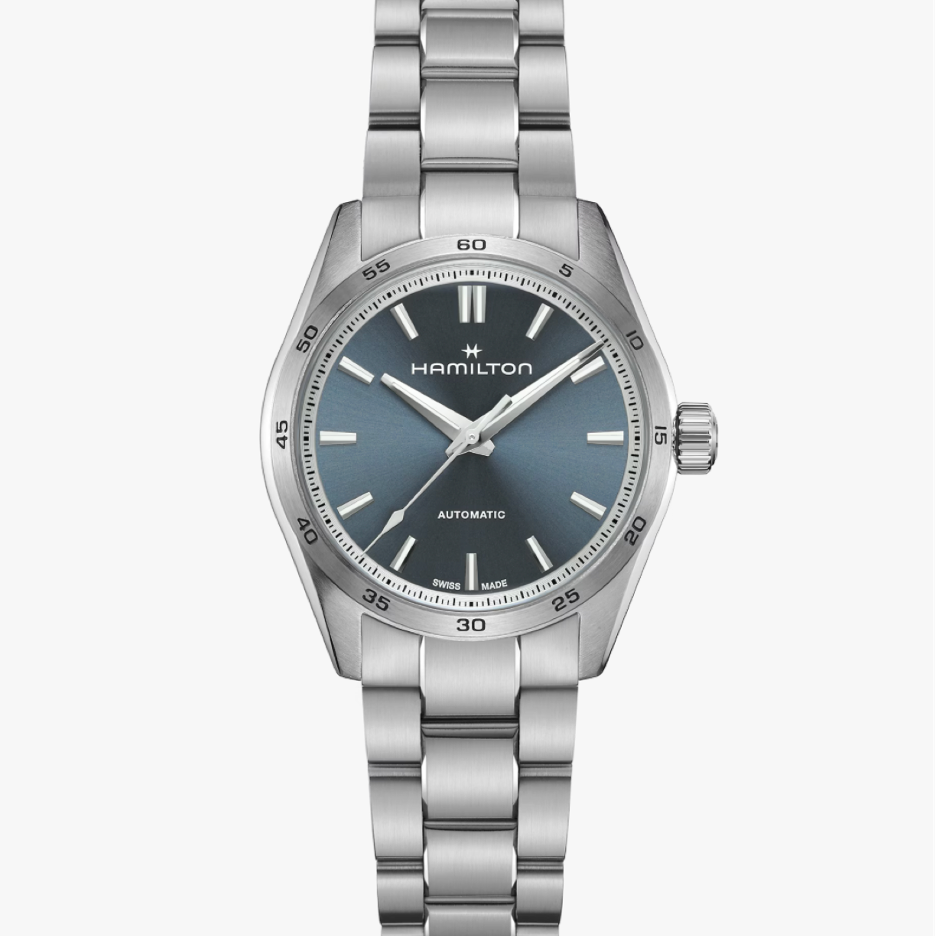 Made for those who favor function and style at once, the Jazzmaster Performer line offers a powerful sport-chic appearance. Powered by the H-10 automatic movement with 80 hours power reserve, this Jazzmaster Performer Automatic features a 34mm stainless steel case accented by an understated light blue dial and a refined stainless steel bracelet.