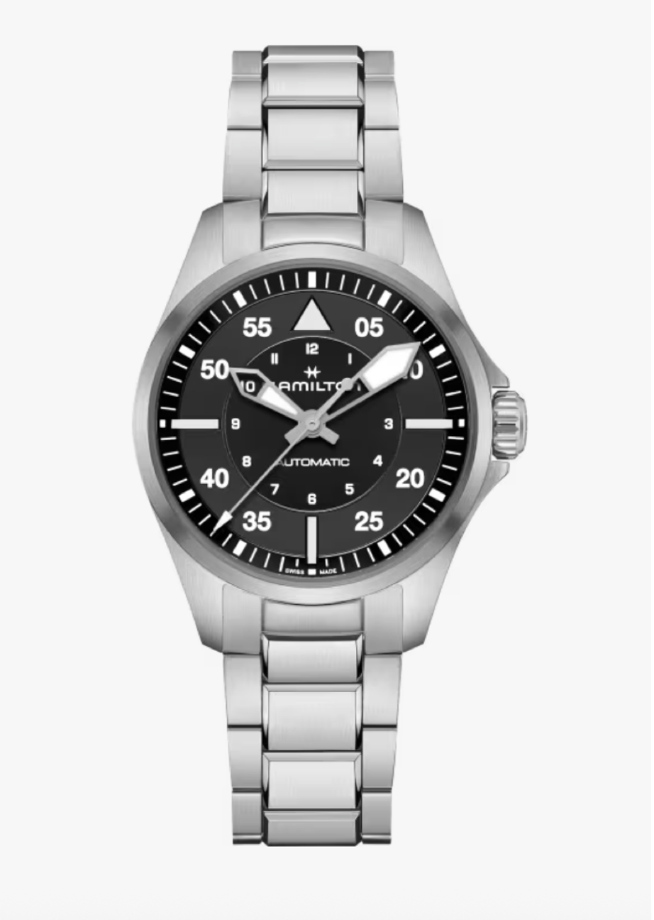 Crafted for true aviation lovers, the Khaki Pilot Auto evokes the spirit of exploration and adventure of the Khaki. Powered by the H-10 automatic movement with an 80-hour power reserve and Nivachron™ balance spring, the 36mm versions answer the trend for smaller watches. While up to the standards of precision for the cockpit, these more compact designs lend themselves to life in the skies and on terra firma. The Khaki Pilot Auto pairs a timeless stainless-steel bracelet with a stylish black dial and special Super-LumiNova coating for greater readability.