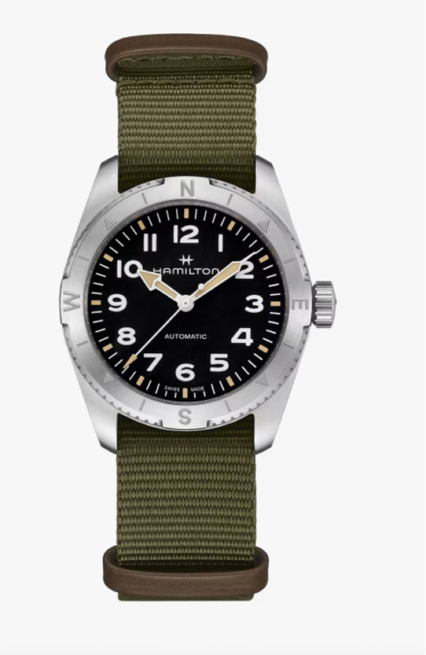 Gearing up for the great outdoors just got easier, thanks to the Khaki Field Expedition and its new NATO Strap. An all-terrain adventure watch with a compass design, enabling you to navigate your next excursion with the help of the sun. Housed in a 37mm stainless steel case and paired with a green NATO textile strap, it is equipped with a screw-down crown and a black sandblasted dial, making it your toughest timepiece yet.