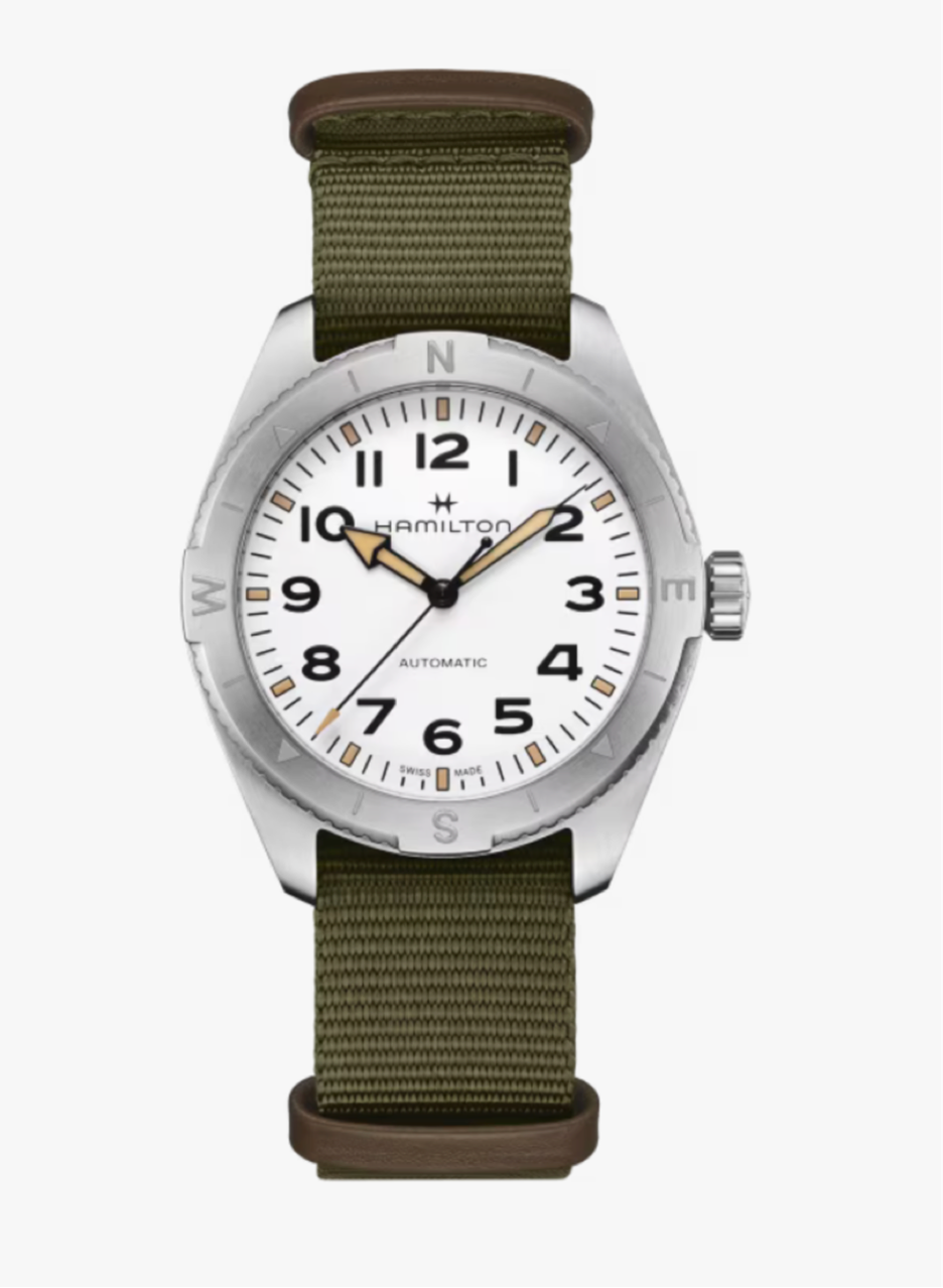 Gearing up for the great outdoors just got easier, thanks to the Khaki Field Expedition and its new NATO Strap. An all-terrain adventure watch with a compass design, enabling you to navigate your next excursion with the help of the sun. Housed in a 41mm stainless steel case and paired with a green NATO textile strap, it is equipped with a screw-down crown and a white sandblasted dial, making it your toughest timepiece yet.