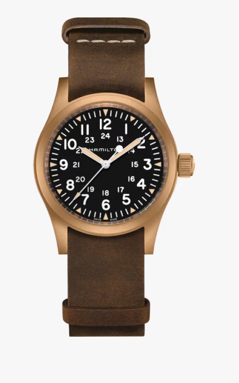 The original soldier's watch gets an original upgrade with Hamilton's first-ever bronze case. Each Khaki Field Mechanical Bronze has a unique story that will unfold with each wear as its case develops a distinct patina over time. Powered by our exclusive hand-wound H-50 movement, fitted to a titanium case back and matched with a soft brown leather NATO strap, this authentic 38mm favorite celebrates Hamilton's military heritage with an eye towards the future. What story will your field watch tell?