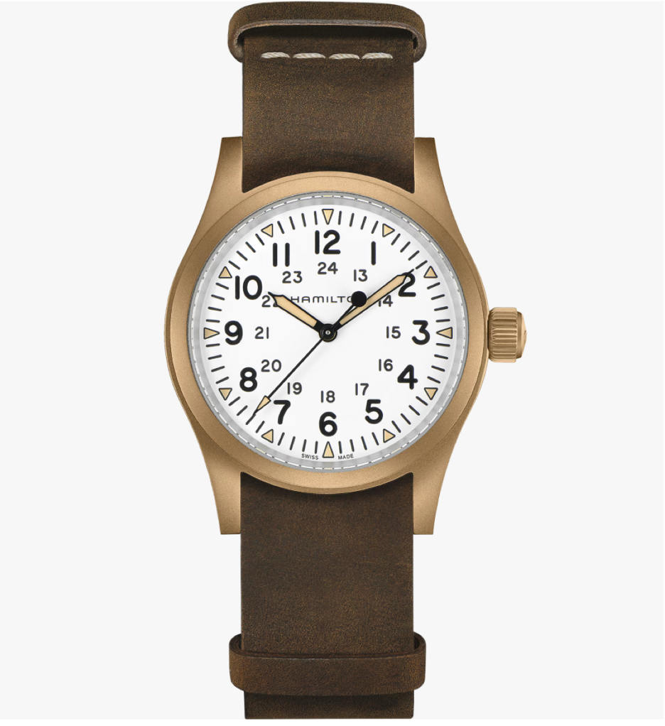 The original soldier's watch gets an original upgrade with Hamilton's first-ever bronze case and white dial. Each Khaki Field Mechanical Bronze has a unique story that will unfold with each wear as its case develops a distinct patina over time. Powered by our exclusive hand-wound H-50 movement, fitted to a titanium case back and matched with a soft brown leather NATO strap, this authentic 38mm favorite celebrates Hamilton's military heritage with an eye towards the future. What story will your field watch tell? *Each Khaki Field Mechanical Bronze case will develop its own individual patina based on environmental exposure. Allow the patina to develop for a unique look. You may use a microfiber cloth to clean the watch.