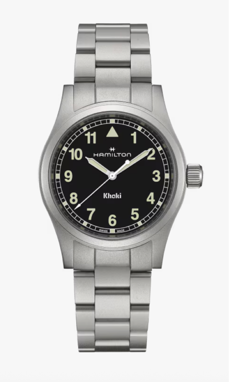Primed for adventure, the Khaki Field Quartz is a reliable and rugged companion ready for exploration. Taking inspiration from Hamilton's reputation for precision, innovation and utility-focused design, the Khaki Field Quartz pairs a timeless black 38mm dial with a modern metal bracelet.