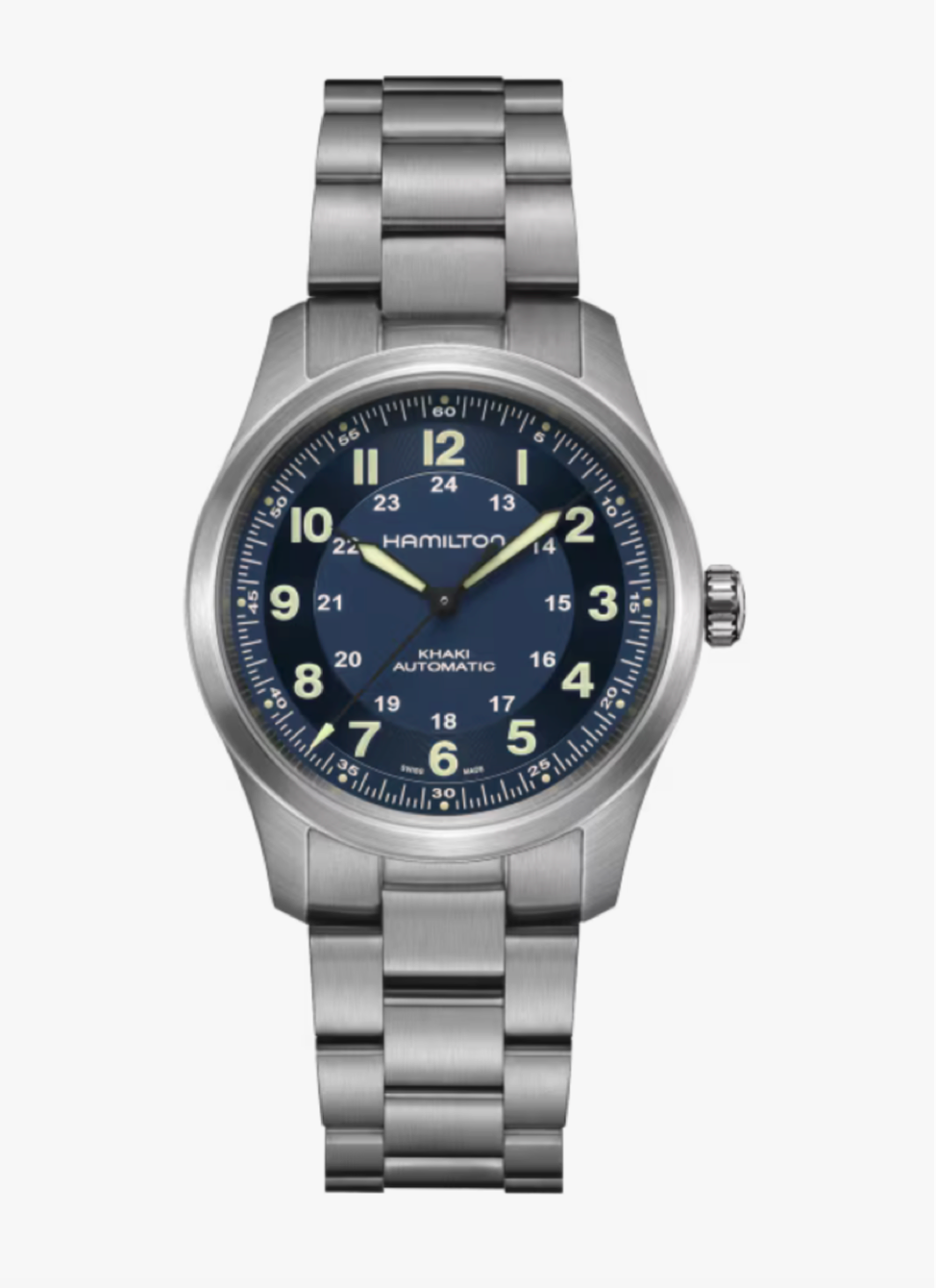 Featuring a titanium case and bracelet, the 38mm Khaki Field Titanium is a highly versatile watch that can be worn for any occasion. Its blue dial with optimized legibility will keep you on track through any adventure, while its bracelet features a brushed finish that adds ruggedness and character to its military design. Pairing lightweight functionality with military style, the Khaki Field Titanium is your reliable companion when in pursuit of new experiences.