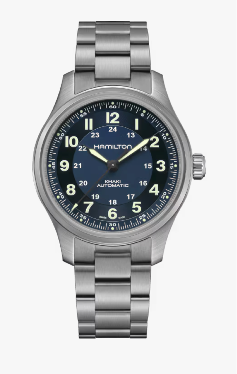 Featuring a titanium case and bracelet, the 42mm Khaki Field Titanium is a highly versatile watch that can be worn for any occasion. Its blue dial with optimized legibility will keep you on track through any adventure, while its bracelet features a brushed finish that adds ruggedness and character to its military design. Pairing lightweight functionality with military style, the Khaki Field Titanium is your reliable companion when in pursuit of new experiences.