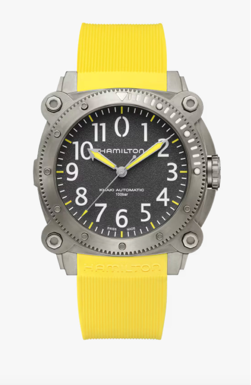 Water resistant up to 100 bar (1,000 m) and equipped with a helium escape valve, the Khaki BeLOWZERO is perfect for even the most daring of deep water adventures. The convex sapphire crystal offers high-performance protection during underwater exploration and its bright yellow rubber strap, paired with a 46mm brushed titanium case make it reminiscent of the bulk of a yellow submarine. This Hamilton is a nautical classic designed for marine pioneers.