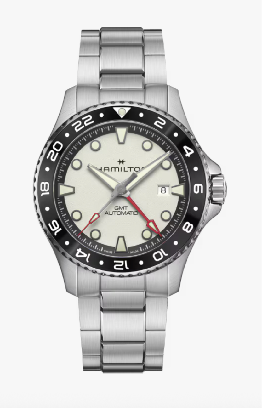 Designed for modern mariners and salty sea dogs, the Khaki Navy Automatic GMT is the ultimate traveler's watch, thanks to its precise timekeeping across multiple time zones. Boasting a stainless steel case with a brushed bracelet, the grained white dial is accented by light green Super-LumiNova® indexes, while a red hand indicates the GMT function and facilitates the unmissable reading of the second time zone. Featuring 30-bar water resistance, screw-down crown and a power reserve of up to 80 hours, the Khaki Navy Automatic GMT will ensure you dive into new horizons with confidence and style.