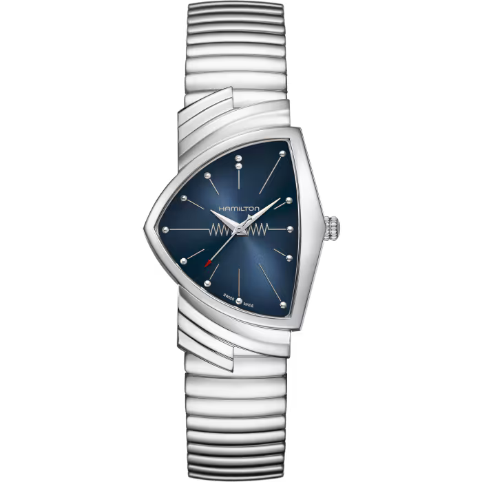In 1957, Hamilton introduced the first electric watch, the Ventura. This revolutionary timepiece ushered in a new era of watchmaking, establishing itself as an emblem of futuristic design and as a symbol of innovation. Inspired by Elvis Presley's hit single, "Blue Suede Shoes", the Ventura Quartz is equipped with nickeled hour, minute, and second hands, and powered by a trusted 3-jewel quartz movement. The iconic, triangular stainless steel case is matched with a flex bracelet, while the deep blue dial calls to mind those famous shoes of Elvis.