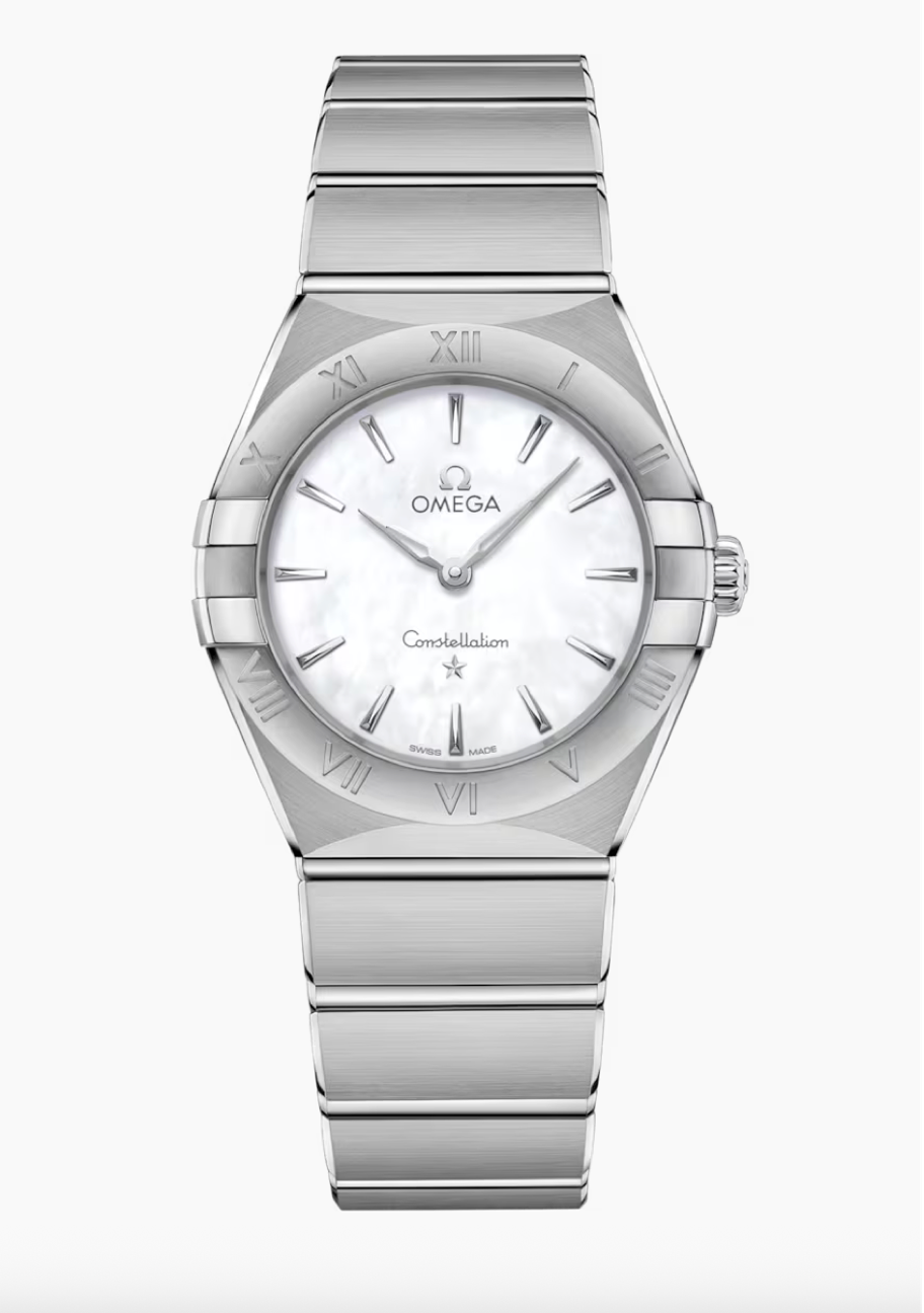 This 28 mm stainless steel model features a bezel engraved with Roman numerals, white mother-of-pearl dial and scratch-resistant sapphire crystal. The hands, OMEGA logo, Constellation star and indexes are in 18K white gold.
