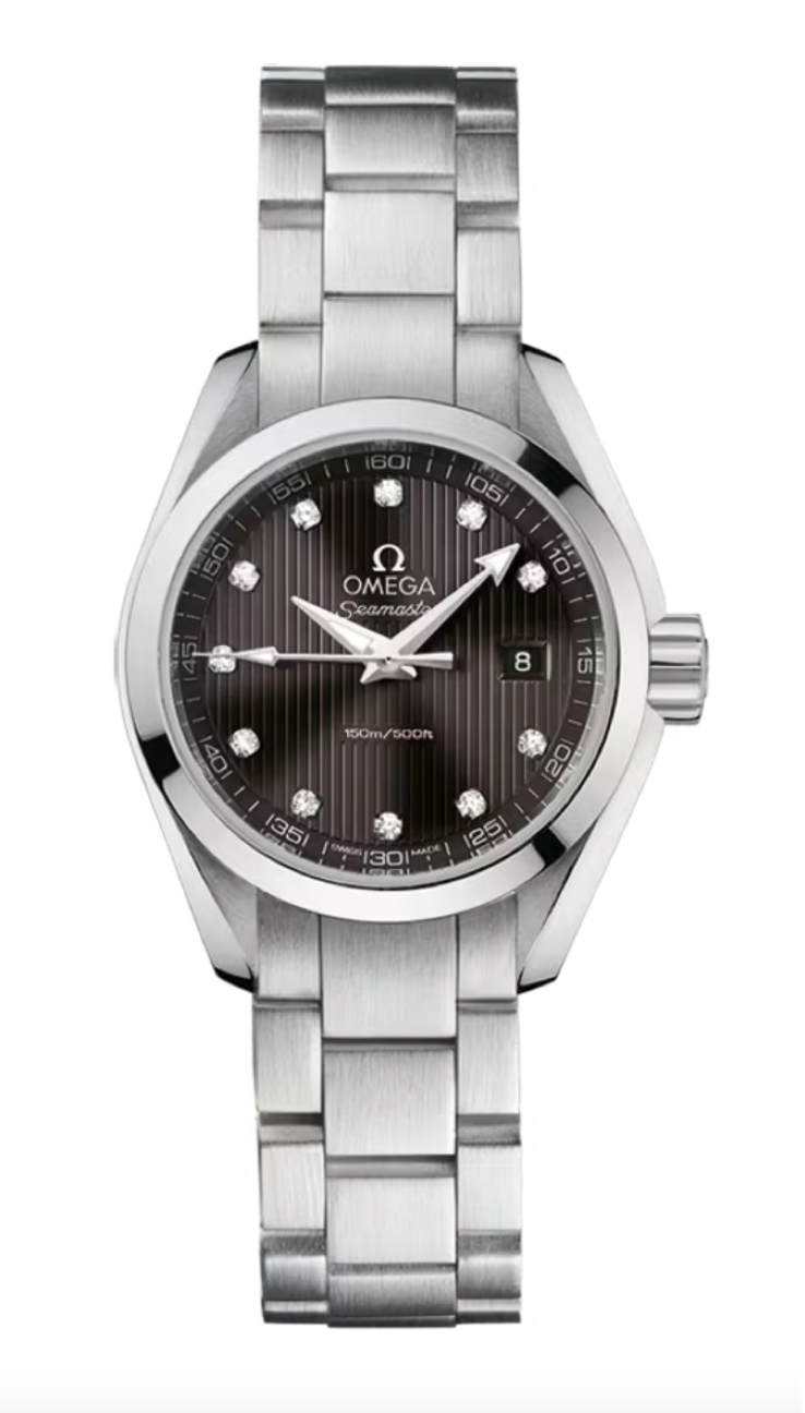 This model features a grey dial decorated with the Teak Concept pattern, diamond-set indexes and a date window at the 3 o’clock position. A scratch-resistant sapphire crystal protects this unique dial. The bezel is mounted on a 30 mm stainless steel case on a stainless steel bracelet. This timepiece is powered by OMEGA's calibre 4651, a quartz precision movement.